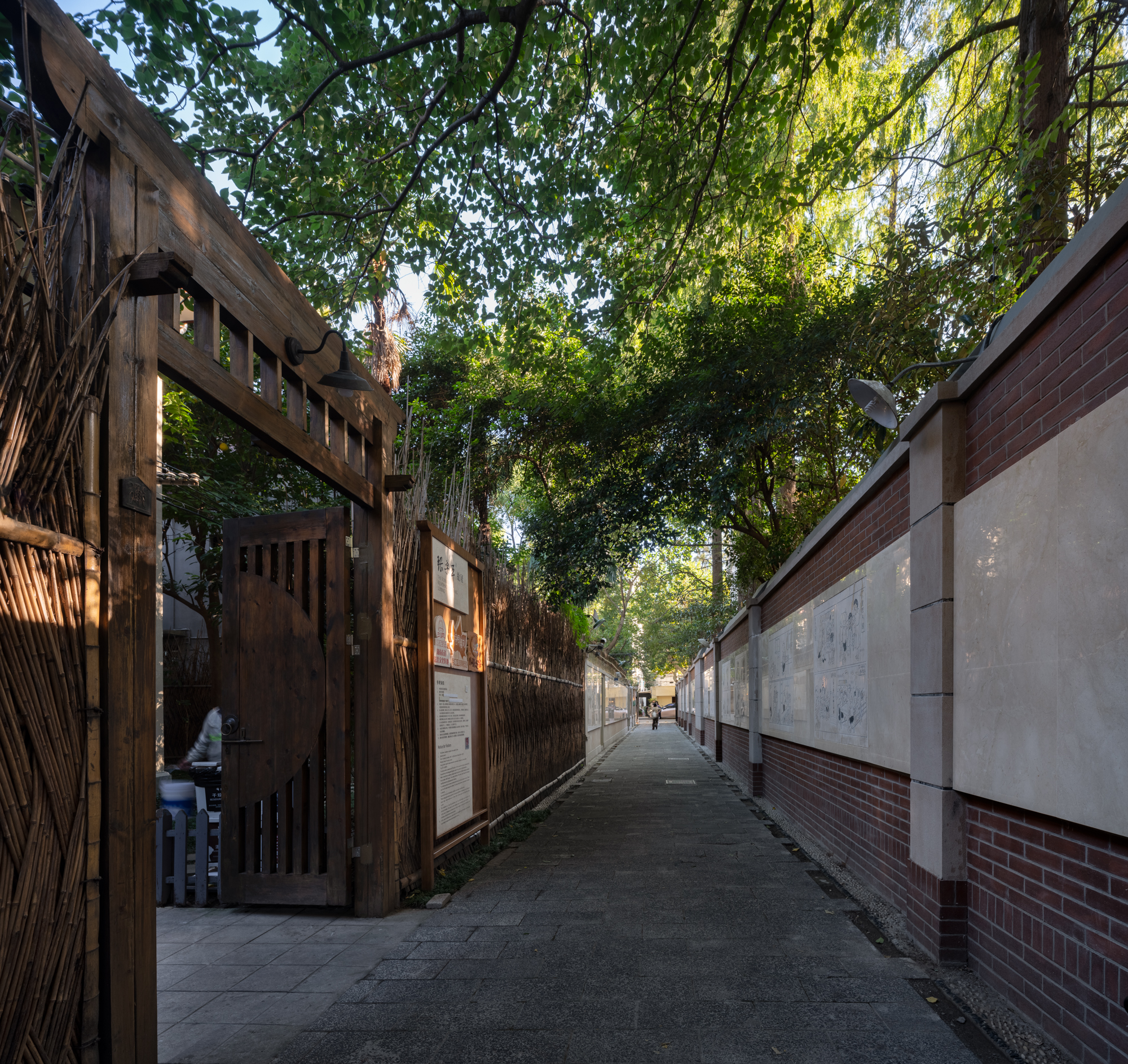 更新提升弄堂口及围墙,使其风格更加统一协调。弄堂口设置三毛与张乐平的艺术浮雕,并配以介绍文字,彰显文化内涵。沿线围墙结合原有的三毛漫画作品整体提升其风貌与品质,增强艺术表现力和视觉冲击力。并在张乐平故居前精细化设计符合故居特色的门户宣传栏,提升空间识别度与文化氛围,传递三毛文化艺术精神。