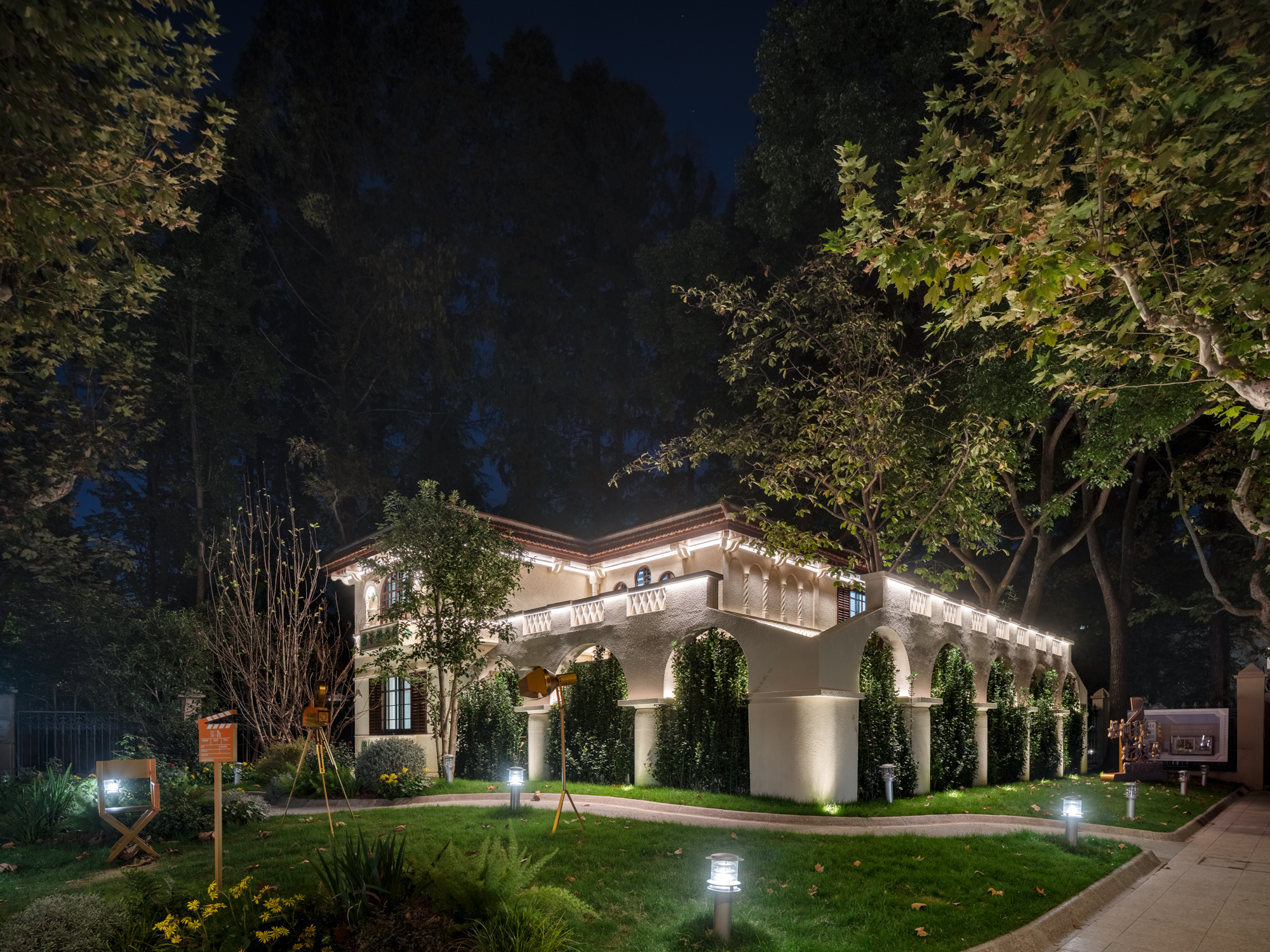 节点位于复兴西路永福路路口的一处转角绿地,紧邻上海电影集团。在尊重原有历史风貌的基础上,依据围墙内部西班牙式优秀历史建筑风貌,对现状建筑进行整体提升更新。外延西班牙式建筑的拱券门廊元素,将变电站巧妙隐于门廊之下使其与整体环境融合。同时,结合电影文化意象,以火车头装置美化设备箱,结合地面设置铁轨样式的地雕,重塑电影时光旅程,强化电影叙事的沉浸感,营造一个融合观赏、休憩与文化体验于一体的电影主题开放空间。