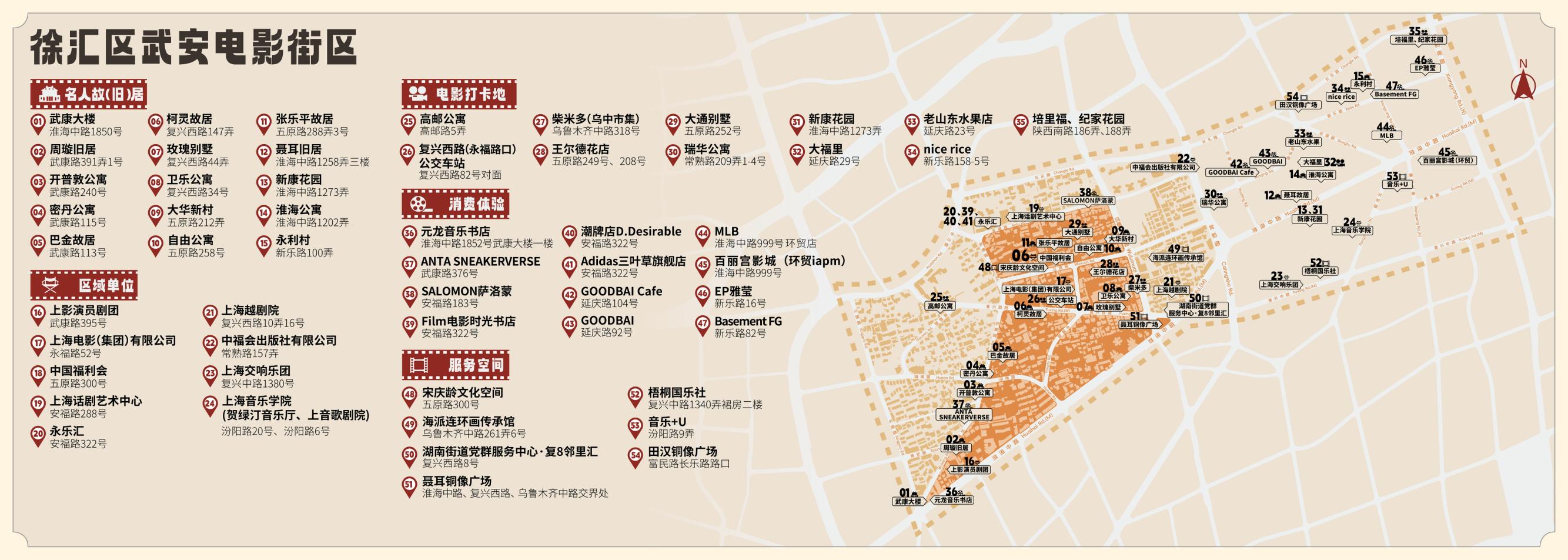 “武安电影街区”位于上海衡复历史文化风貌区,由安福路、乌鲁木齐南路、淮海中路、武康路围合而成,占地42.2公顷。核心范围为武康大楼至安福路沿线,历史肌理与建筑风貌保存完好,尺度宜人,沿线环境兼具生活气息与人文氛围,区域内电影资源尤为丰富,涵盖电影相关艺术团体、知名电影人旧居以及多处经典影视取景地,形成了独特的文化标签与城市记忆。