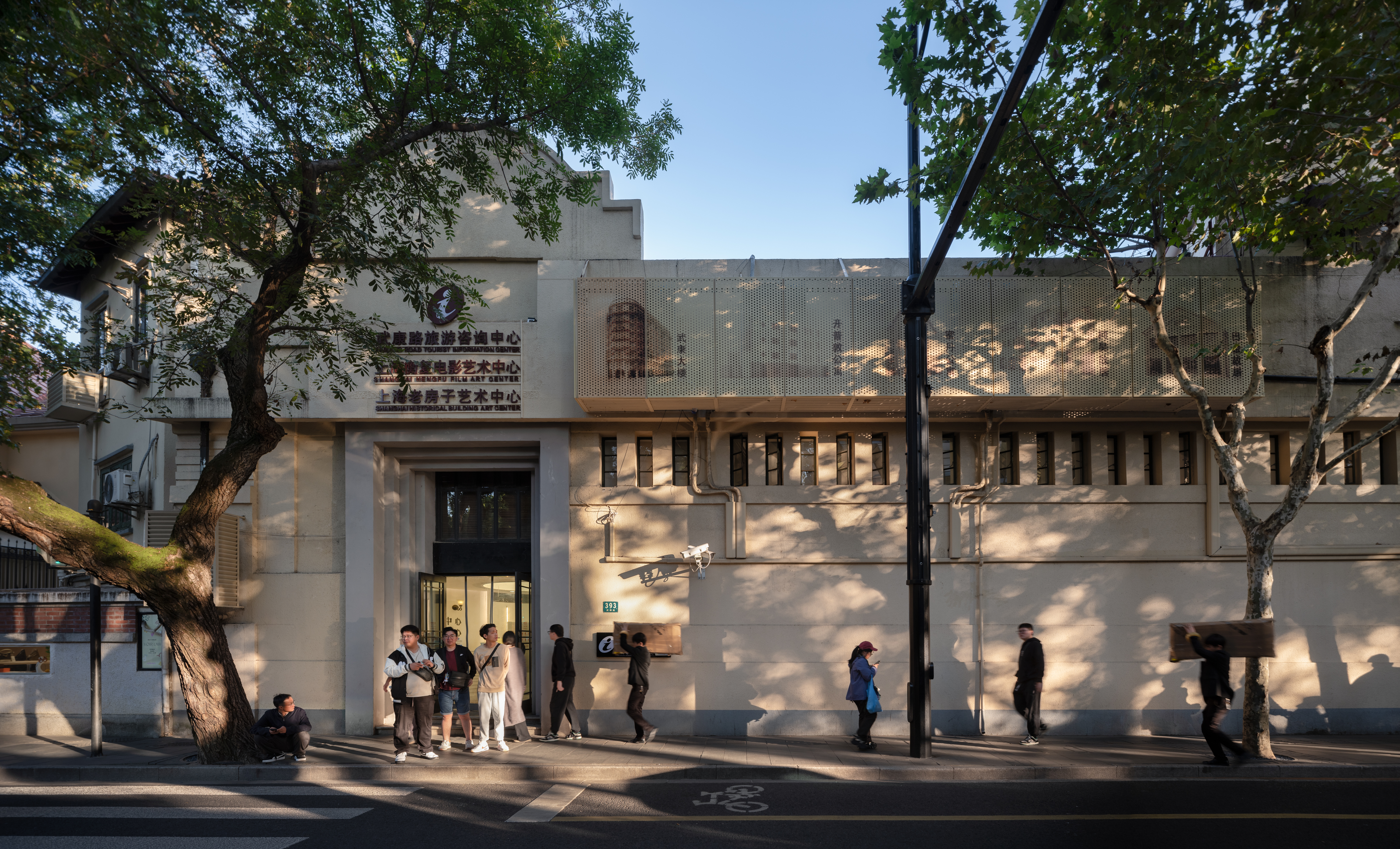 武康路393号原为老房子艺术中心,依托武安电影街区的整体打造,此次改造对建筑内部功能与外部环境进行整体提升。对其功能,在原文旅公共服务中心的基础上引入电影主题互动空间,打造电影艺术中心。沿街景观,建筑外立面整体翻新提升,并巧妙利用现状空调外机的装置,选取武康大楼、密丹公寓、开普敦公寓等著名建筑轮廓,通过冲孔板工艺进行艺术化表达。
